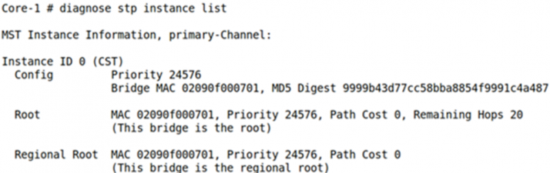 Three FortiSwitches are managed by FortiGate. When reviewing the STP instances on all three switches, you notice that, before any STP settings were manually configured, FortiSwitch Core-1 was selected as the root bridge.