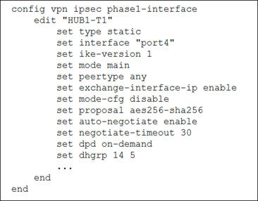The VPN configuration on a spoke and a hub is shown.