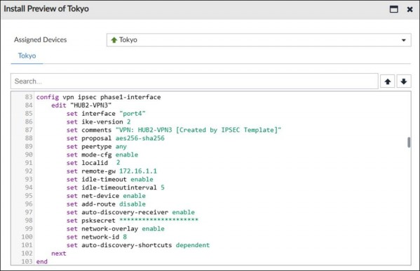 The administrator used the SD-WAN overlay template to prepare an IPsec tunnel configuration for a hub-and-spoke SD-WAN topology. The exhibit shows the FortiManager installation preview for one FortiGate device.